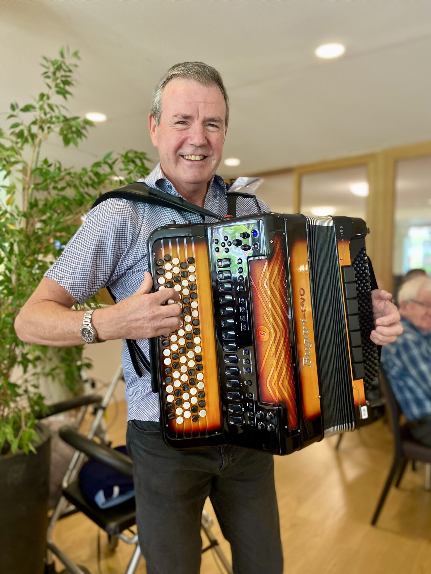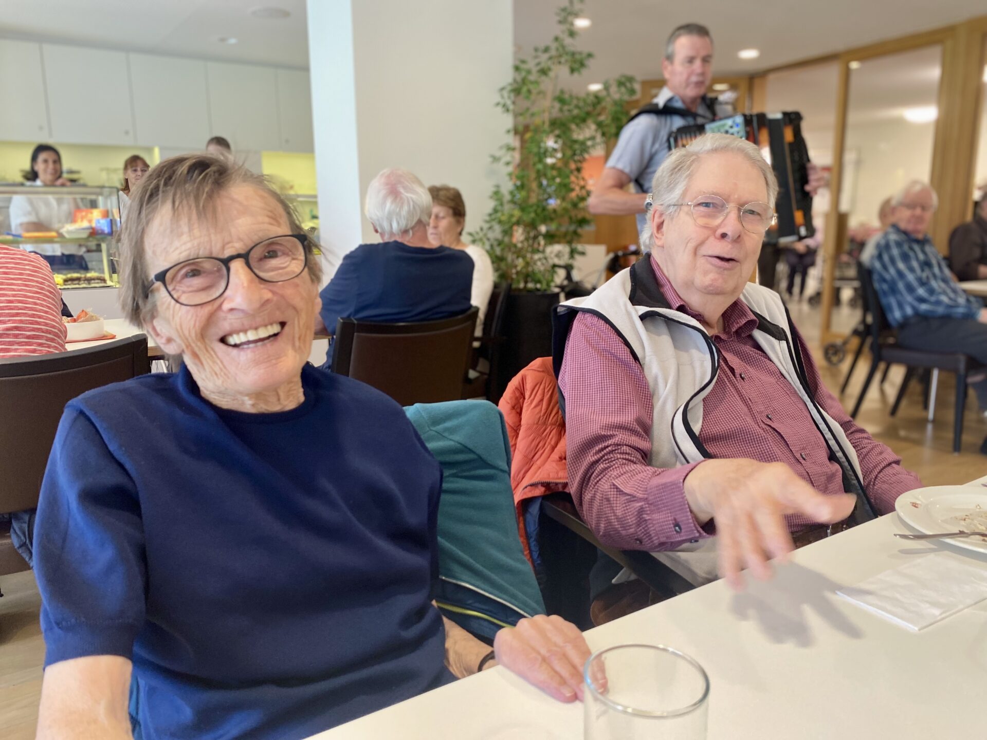 Wieder einmal war Fridolin bei uns im La Pumera mit seiner Handorgel. Lüpfige Musik und ein voller Saal sorgten für eine super Stimmung bei Gästen und Bewohnenden. Die Beine wollten zwar nicht so richtig, aber dafür wurden die Arme im Takt geschwungen. Es war wieder einmal ein geselliger Nachmittag zum Mitsingen, Mitbewegen und vor allem zum Lachen und Fröhlichsein. Danke Fridolin und bis bald wieder!