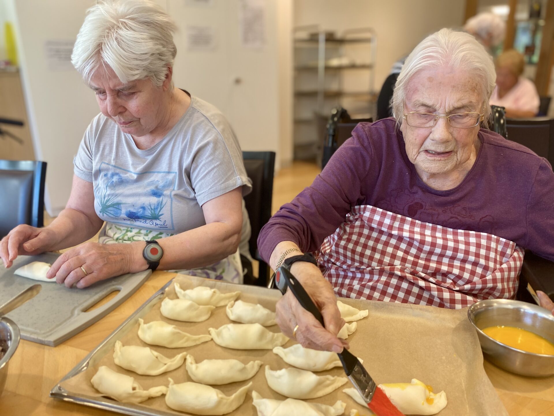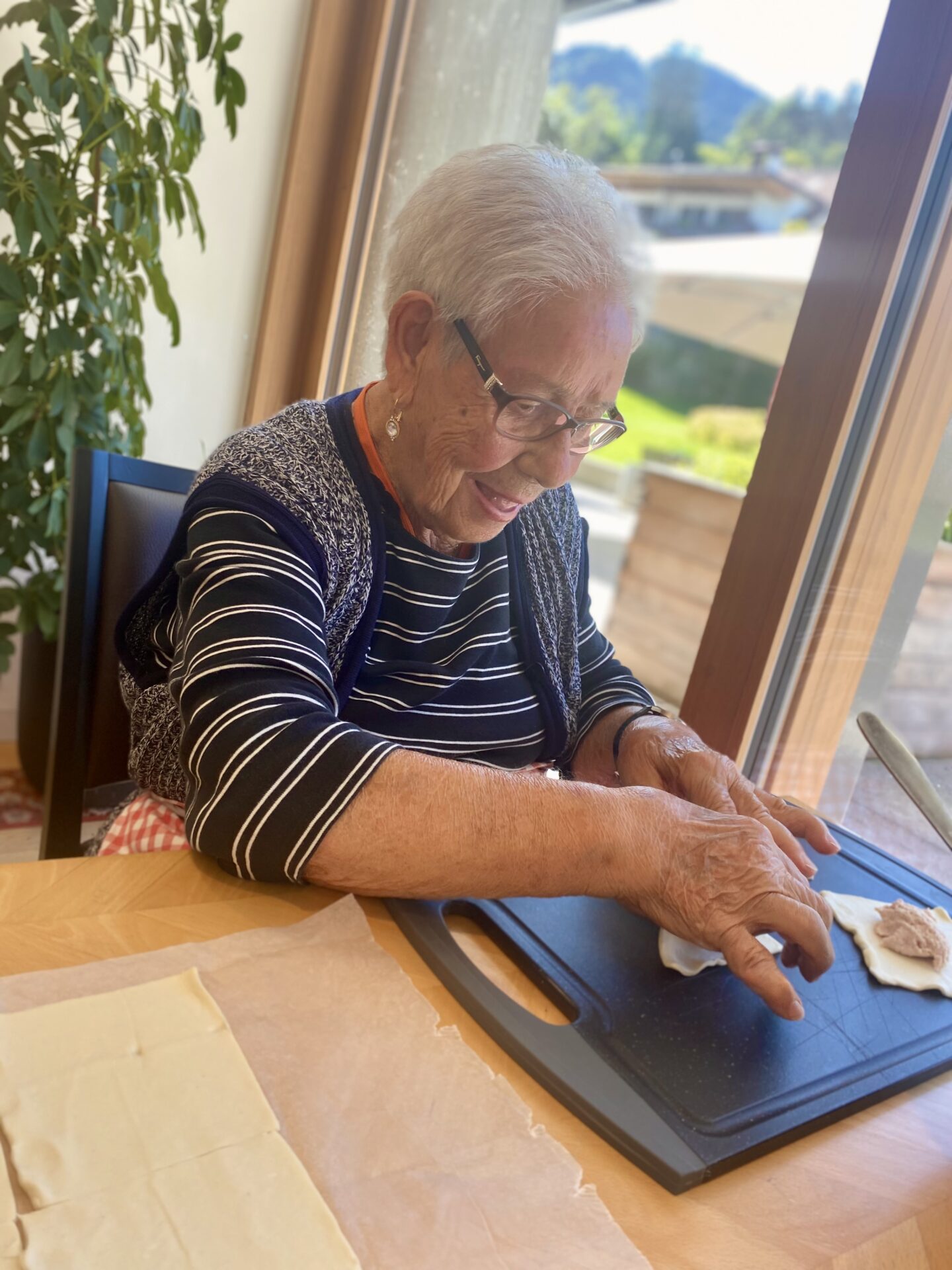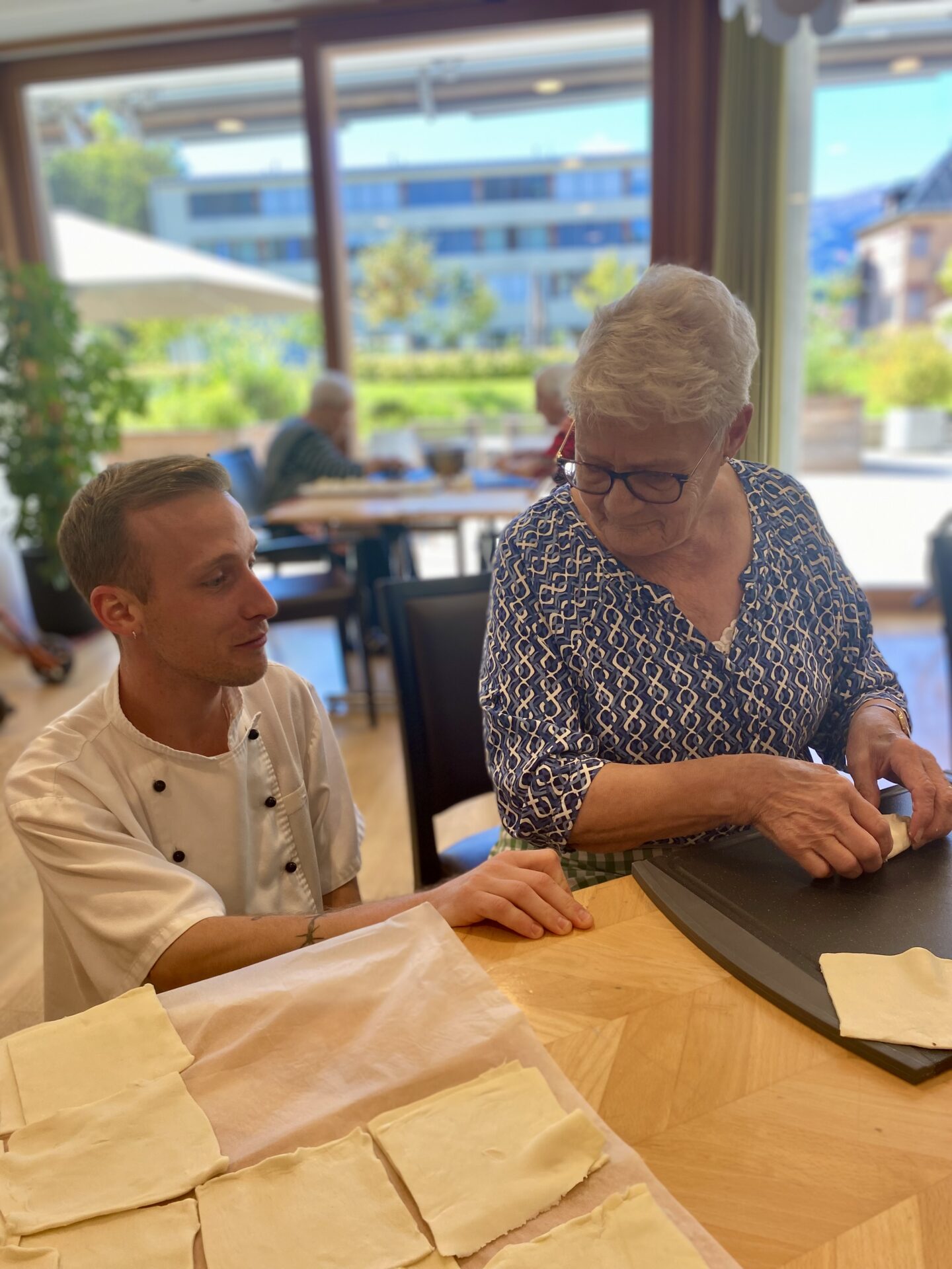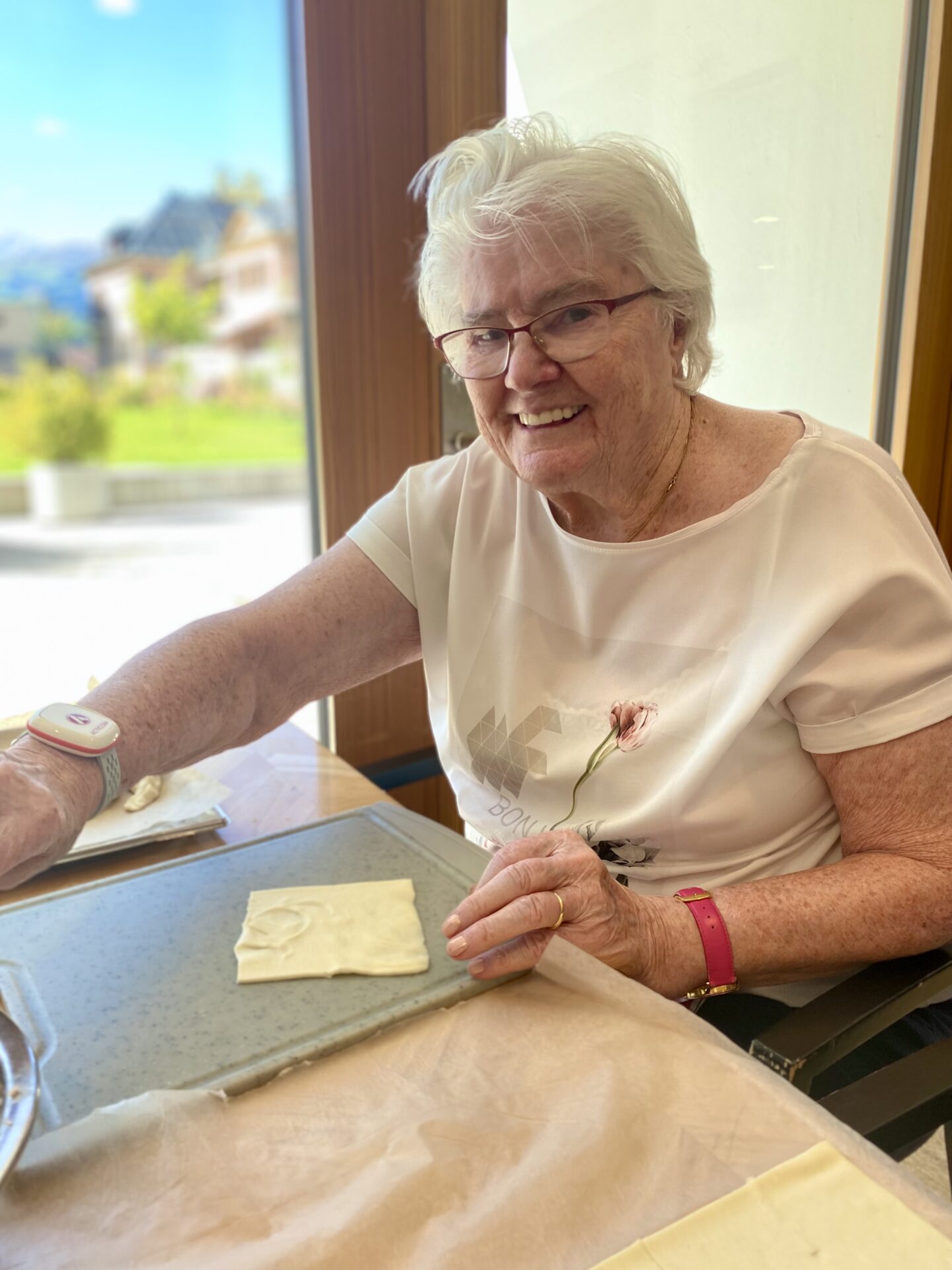 Hochkonzentriert und richtig fleissig waren unsere Bewohnerinnen vom La Pumera letzthin, als es um die Zubereitung von Schinkengipfeli ging. Den Teich zuschneiden, Füllung darauf, einrollen und mit Eigelb bestreichen, alles musste genau und sauber ausgeführt werden. Die Schinkengipfeli mundeten prima!