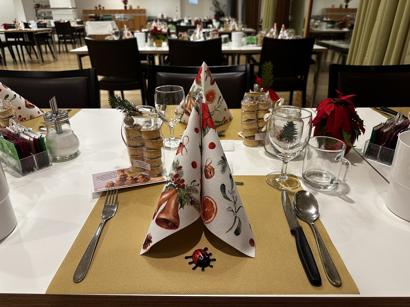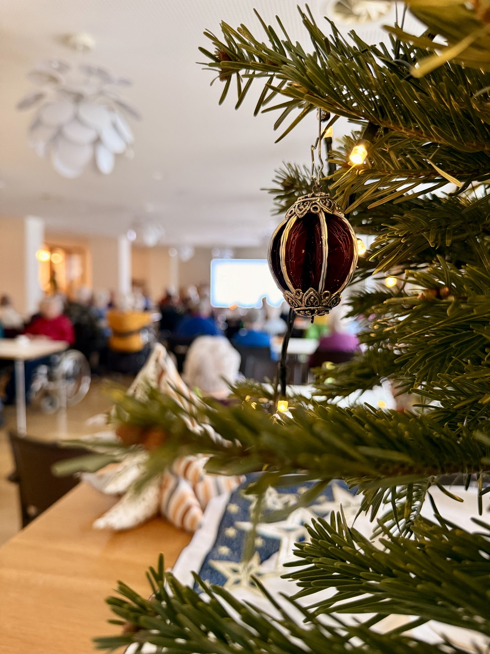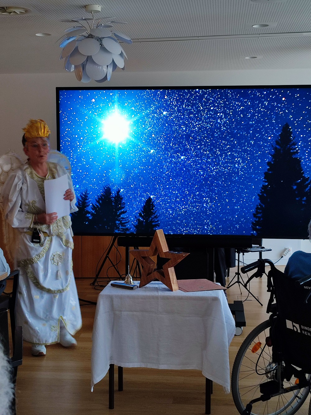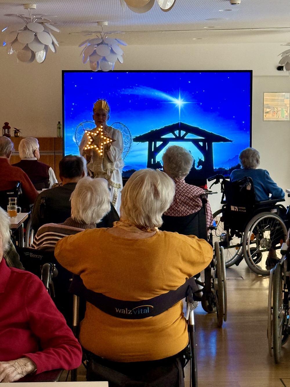 Am 24. Dezember 2025 besuchte uns der Weihnachtsengel und überbrachte die frohe Botschaft der Weihnachtsgeschichte. Nach einem festlichen Mittagessen bescherte er uns der einen besinnlichen und feierlichen Nachmittag mit Musik und Gesang. Am 25. und 26. Dezember durften wir sehr viele Gäste bei uns begrüssen, die mit ihren Liebsten ihr Weihnachtsfest feierten und das Weihnachtsmenü genossen. Auf den Wohngruppen wurden die Bäume feierlich geschmückt und versprühten mit ihrem Tannenduft weihnächtliche Stimmung. Schön war‘s!